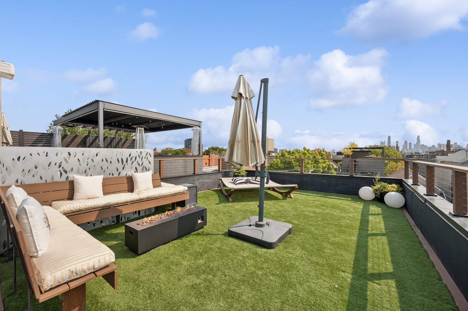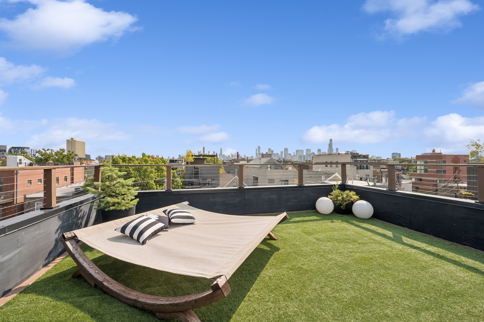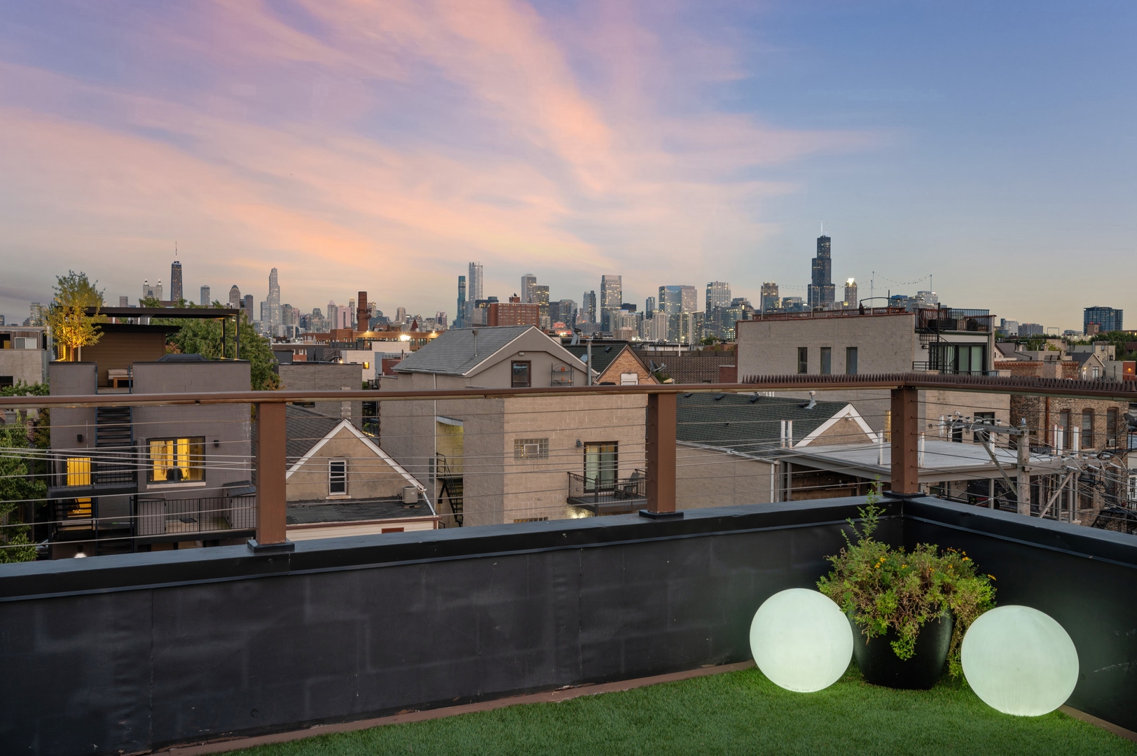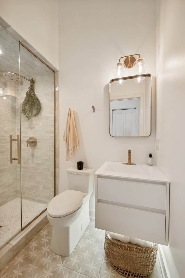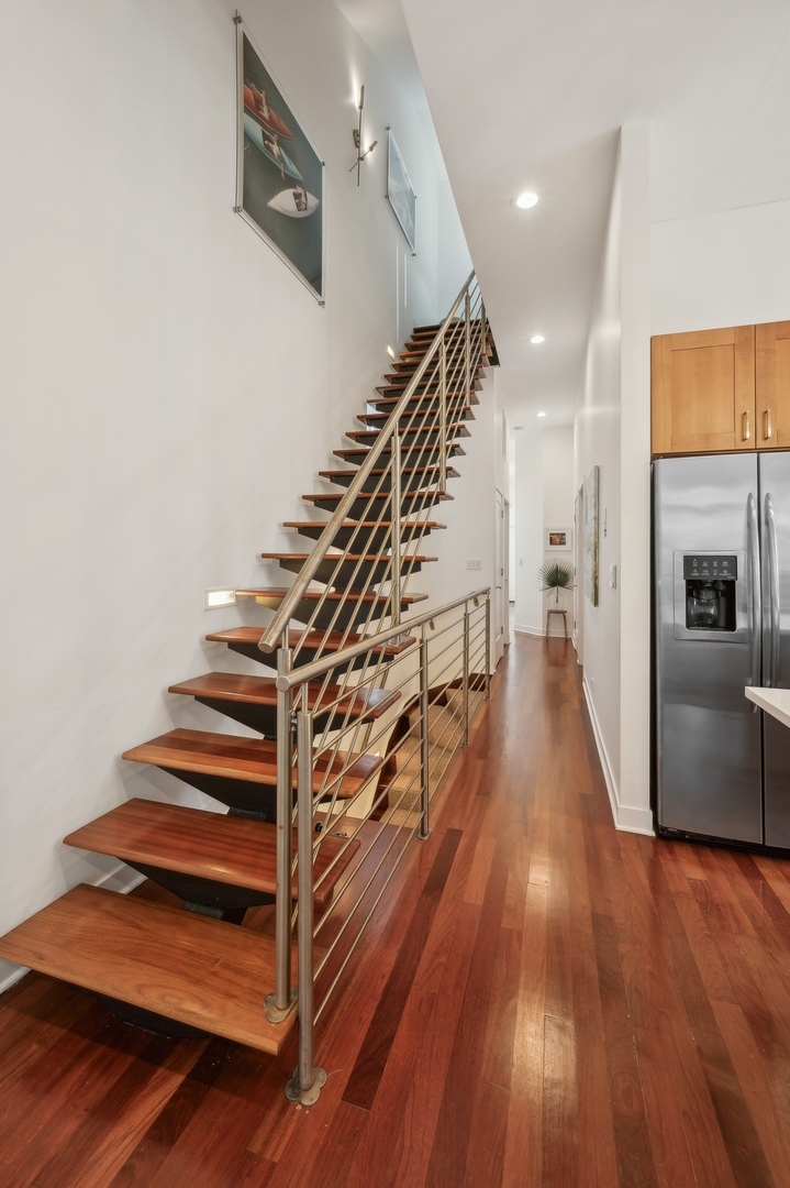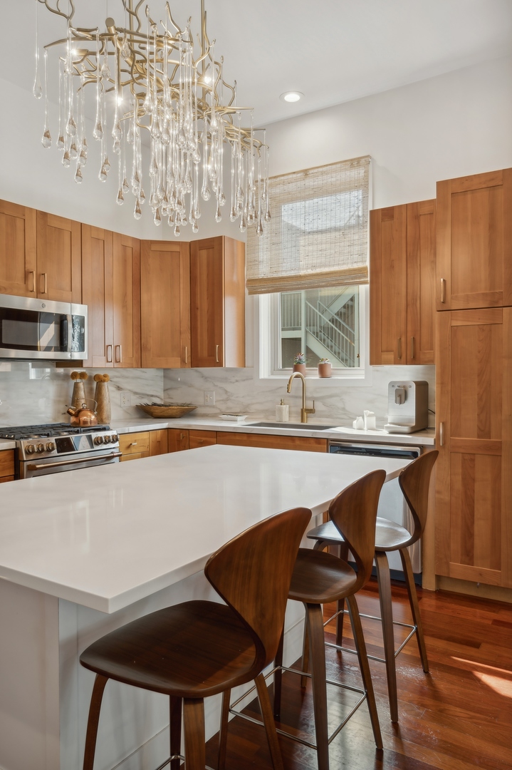 East Village Penthouse with private built out Rooftop deck! Located in the heart of booming West Town, this meticulously updated 2 bed, 2 bath condo with 11ft ceilings offers breathtaking finishes met with timeless charm. This sun-drenched, west-facing, open concept floor plan features a stunning remodeled kitchen - upgrades include quartz island, porcelain countertops, GE 6 burner range and complete GE appliance package. Living room features a stunning stone gas burning fireplace, Carrera marble window ledges, new window treatments, lighting fixtures, ceiling fans and hardware throughout. Right off the living room is easy access to a private built out rooftop deck with skyline views. Down the hall you'll find a gorgeously remodeled guest bathroom and shower, second bedroom and primary bedroom with updated dual vanity ensuite bathroom with a separate shower/jacuzzi tub. Primary bedroom features a recently built out closet and storage system, brand new hardwood floors and an additional outdoor space with brand new Trex decking. Other updates include newly carpeted stair runner entry, Pella doors, Nest Eco thermostat and brand new LG thinQ washer/dryer package. Assigned garage parking space included in the price. Steps to restaurants and cafes, boutique shopping, CTA blue line and all that West Town has to offer!