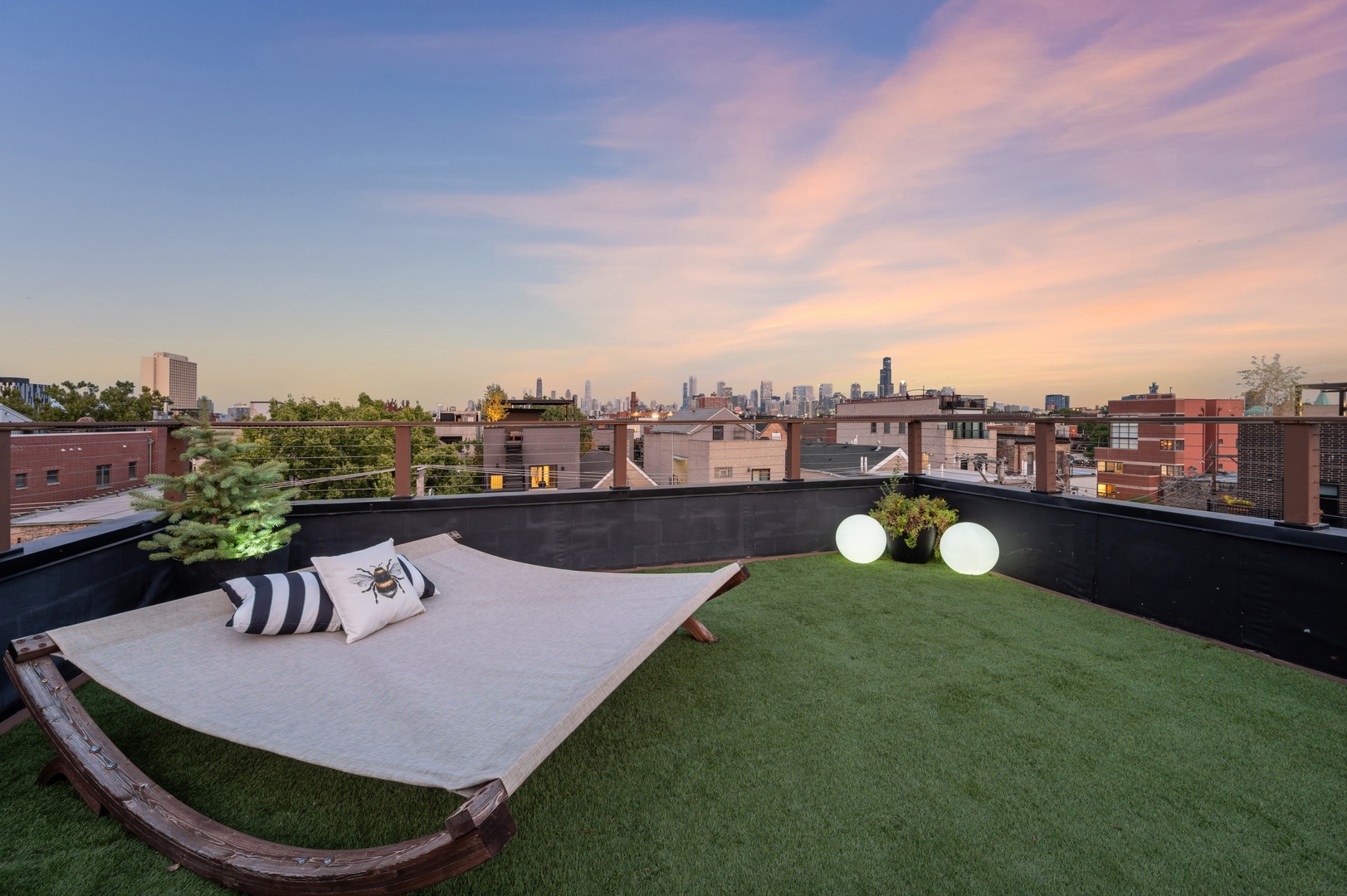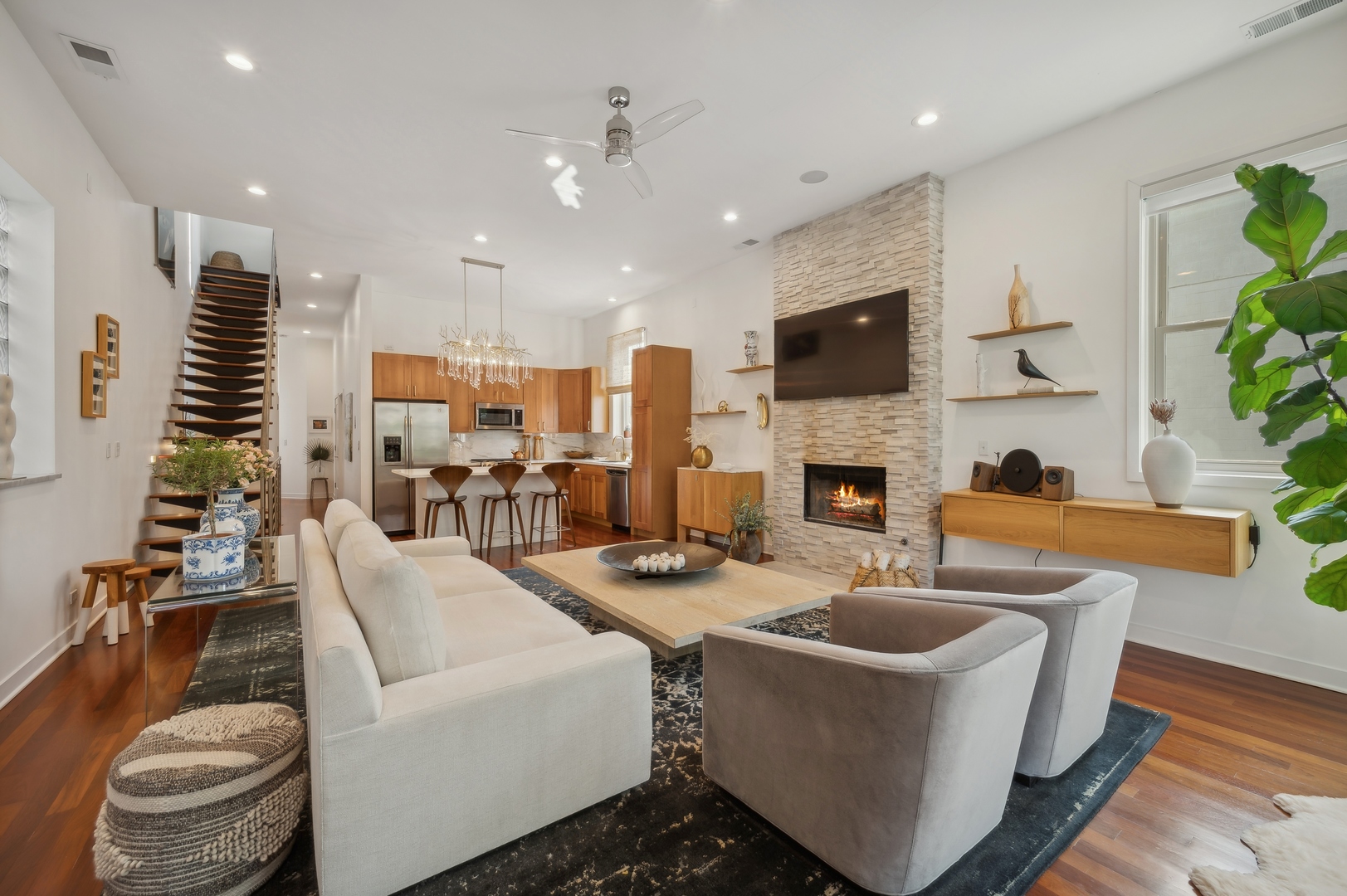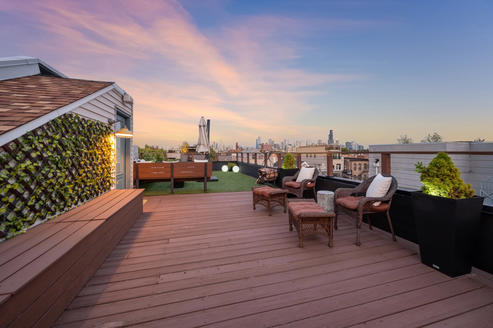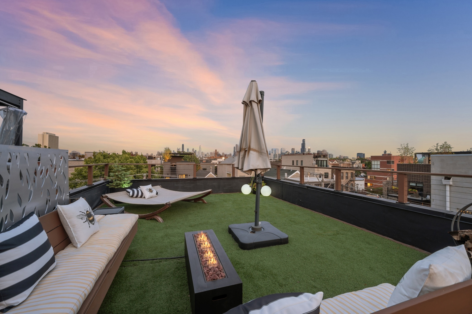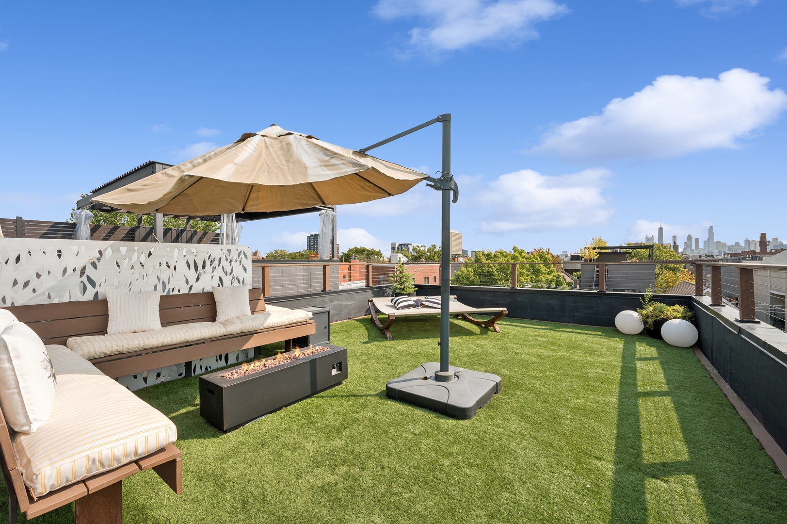 East Village Penthouse with private built out Rooftop deck! Located in the heart of booming West Town, this meticulously updated 2 bed, 2 bath condo with 11ft ceilings offers breathtaking finishes met with timeless charm. This sun-drenched, west-facing, open concept floor plan features a stunning remodeled kitchen - upgrades include quartz island, porcelain countertops, GE 6 burner range and complete GE appliance package. Living room features a stunning stone gas burning fireplace, Carrera marble window ledges, new window treatments, lighting fixtures, ceiling fans and hardware throughout. Right off the living room is easy access to a private built out rooftop deck with skyline views. Down the hall you'll find a gorgeously remodeled guest bathroom and shower, second bedroom and primary bedroom with updated dual vanity ensuite bathroom with a separate shower/jacuzzi tub. Primary bedroom features a recently built out closet and storage system, brand new hardwood floors and an additional outdoor space with brand new Trex decking. Other updates include newly carpeted stair runner entry, Pella doors, Nest Eco thermostat and brand new LG thinQ washer/dryer package. Assigned garage parking space included in the price. Steps to restaurants and cafes, boutique shopping, CTA blue line and all that West Town has to offer!