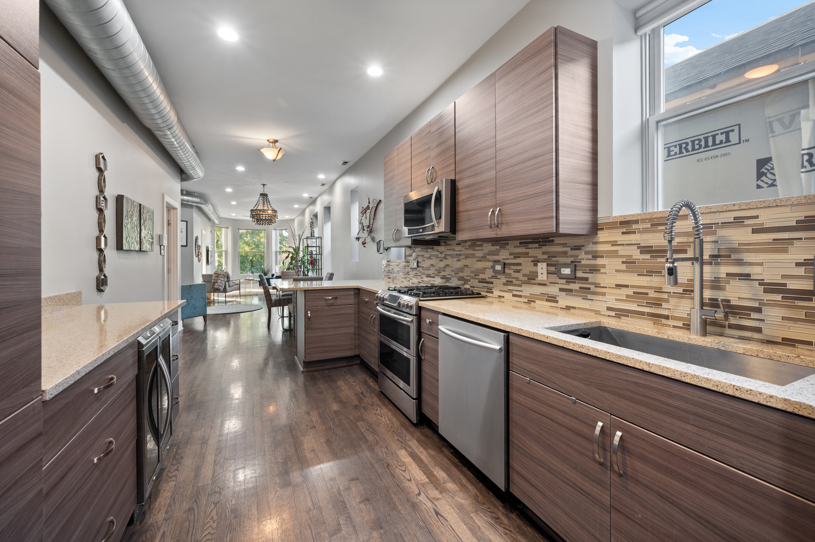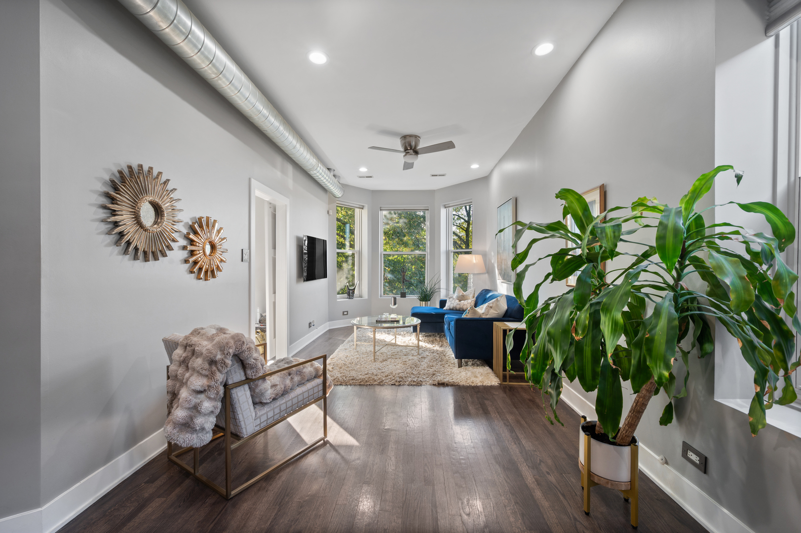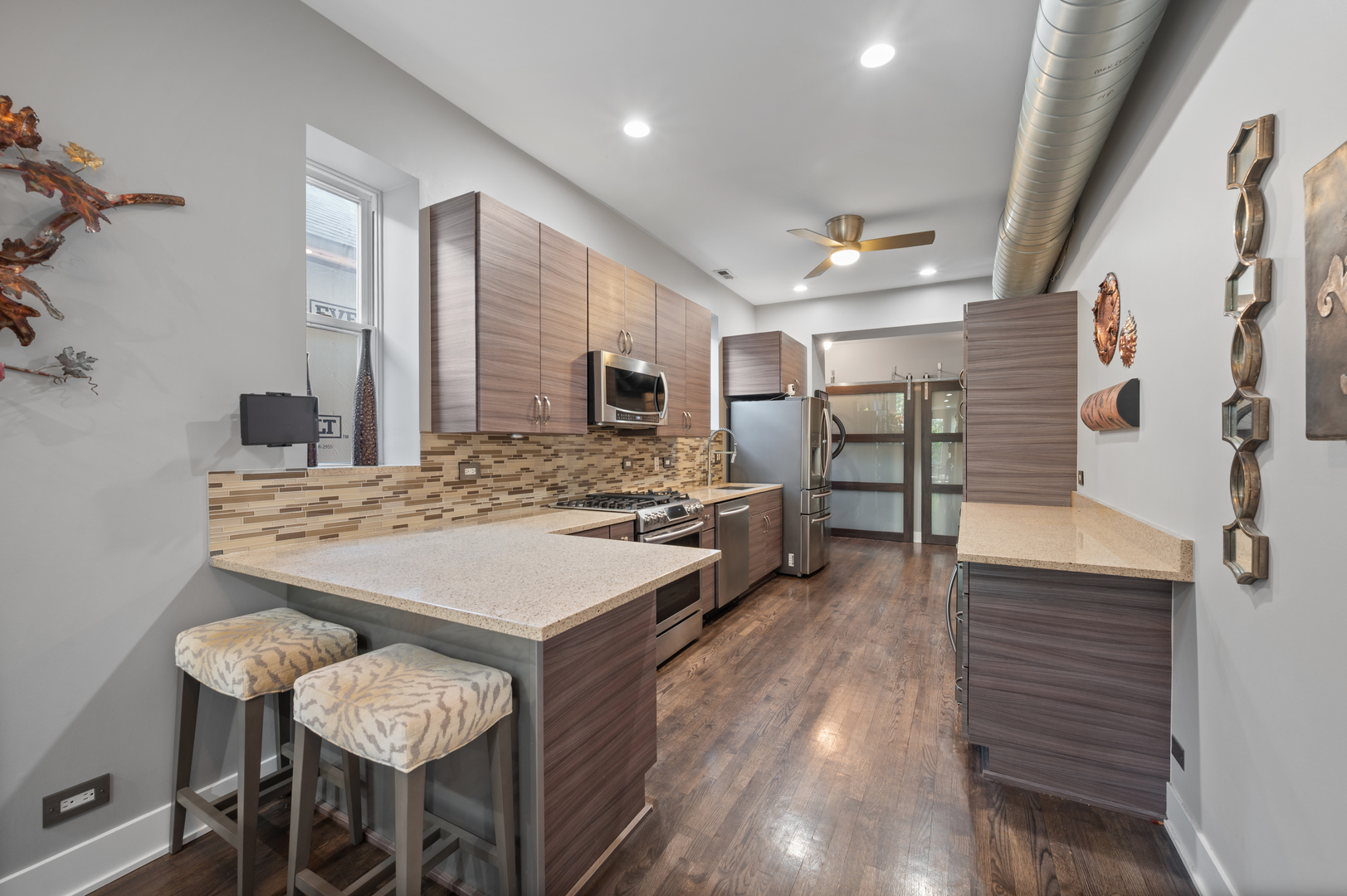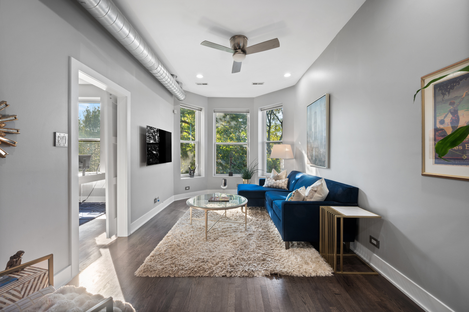 OH scheduled for tomorrow 10/26 has been canceled. Nestled on a quiet, tree-lined street, this beautifully maintained 2-bed, 2-bath condo sits in the heart of Logan Square. The modern home offers a loft-like feel with high ceilings, large windows, and an open layout perfect for entertaining. The kitchen features quartz countertops, a premium Samsung appliance suite with a 5-burner gas stove, custom pantry with sliding shelves, and a ZEPHYR dual-zone wine fridge. The primary suite includes custom ELFA built-ins and a fully renovated, luxury private en-suite with a MOEN smart shower system, ROBERN vanity, and an additional custom-built closet for jewelry and delicates. The second full bath features similar luxury finishes with all MOEN fixtures and a ROBERN vanity. A sun-drenched second bedroom is ideal for guests or a home office, complete with a sliding barn door and custom ELFA closet built-ins. Behind the beautiful custom barn doors at the end of the hall, you'll find full-size stacked laundry and additional storage. Redone in 2005, this well-maintained and well-managed boutique building has seen major upgrades, including brand-new vinyl siding, sanding and rebuffing of all back decks, a 2021 ROOF replacement, and tuck-pointing and painting of the front facade. Secure gated PARKING is included in the price! All just steps from Logan Square favorites like Damn Fine Coffee, Giant, Scofflaw, The Moonlighter, Lula Cafe, and Outside Voices, and within walking distance to the 606 Trail, Logan Square Farmers Market, Palmer Square Park, and only one mile from the Logan Square Blue Line stop. You won't want to miss this one!